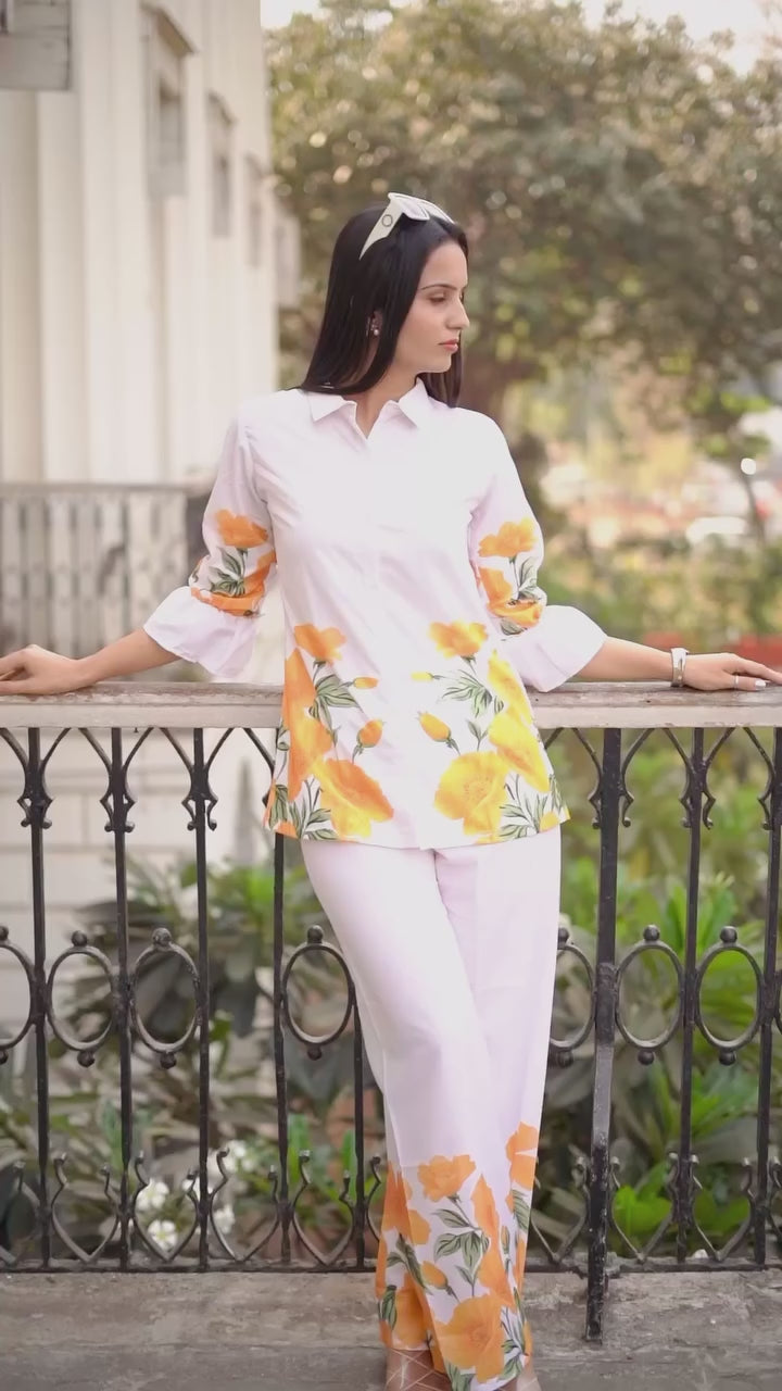 Trendy White Coord Set with Yellow Flowers Print